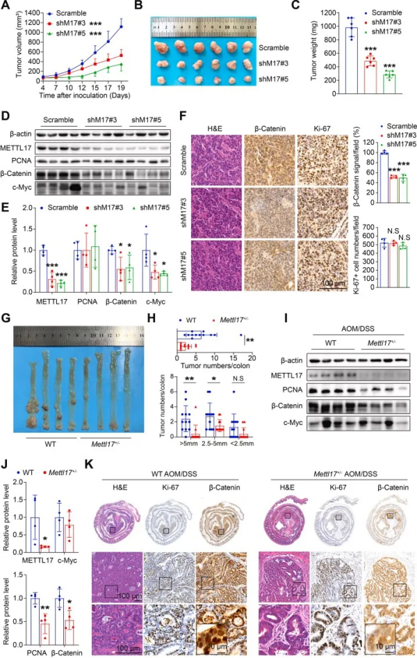 作者将METTL17敲低的SW620细胞和对照SW620细胞分别注射到裸鼠皮下研究METTL17对体内CRC发生的影响,发现:METTL17敲低的肿瘤比对照肿瘤生长得慢得多,重量也小得多。WB和免疫染色分析表明,METTL17敲低的肿瘤β-Catenin表达减少,而PCNA和Ki-67b表达不受影响。