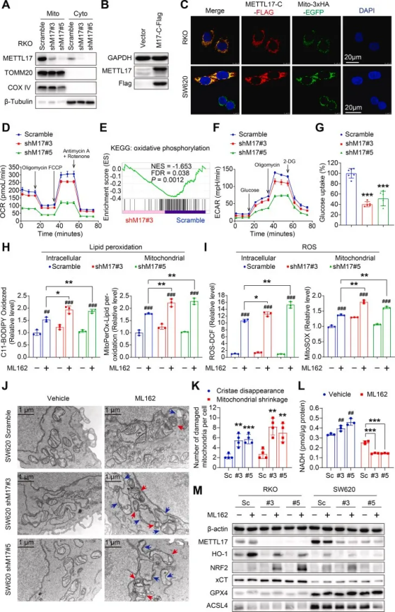 研究思路4:为了阐明METTL17影响铁死亡敏感性和CRC发展的机制,作者研究了METTL17在癌细胞中的分布和功能。发现其主要在线粒体中表达,进一步探讨了METTL17对线粒体功能的影响,以及这一环节与铁死亡之间是否存在联系。
