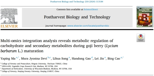 Yaping Ma , Mura Jyostna Devi , Lihua Song, Handong Gao , Lei Jin, Bing Cao.Multi-omics integration analysis reveals metabolic regulation of carbohydrate and secondary metabolites during goji berry (Lyciumarbarum L.) maturation.Postharvest Biology and Technology 218 (2024) 113184