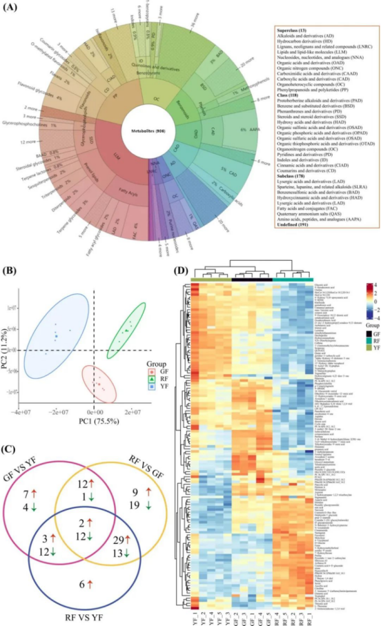 图3 枸杞果实 YF、GF 和 RF 阶段的代谢组学分析