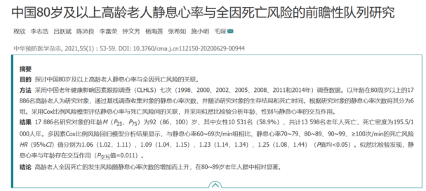 自然是有!一项发表在《中华预防医学杂志》,题为“中国80岁及以上高龄老人静息心率与全因死亡风险的前瞻性队列研究”的文章中,研究人员就对中国老人的静息心率进行了分析研究,结果也显示:高龄老人全因死亡的发生风险随静息心率次数的增加而上升,且在80~89岁老年人群中相对显著。