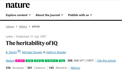 3. Devlin B, Daniels M, Roeder K. The heritability of IQ. Nature. 1997;388(6641):468-471. doi:10.1038/41319