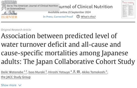 天气渐冷,多喝热水;姨妈来了,多喝热水;想要减肥?多喝热水......多喝热水,似乎成为“包治百病”的良药,没有什么比一句“多喝热水”来得更贴(fu)心(yan)了。当然,水是生命之源。人体的50-70%由水分组成,水在促进新陈代谢、调节体温、维持电解质平衡等多方面发挥着重要作用;而人类在不喝水的情况下仅能生存3天左右,喝水的重要性更是不言而喻。但对成年人而言,一天饮用多少水最为合适呢?像我们从小所熟知的那样“一天饮用8杯水”真的科学吗?近日,来自日本早稻田大学的研究团队在《美国临床营养学杂志》上最新发表的研究总结了人体内水周转量与全因、特定原因死亡率之间的关系,发现两者之间存在“L”型关联。具体来说,当女性的水周转范围保持在3000-3300mL/天,男性在3500-3700mL/天,全因死亡率的危险比(HR)最低。折算下来,相当于女性每日饮水在1275-1400mL之间,男性饮水量在1490-1570mL之间,最符合人体需要。因此,如果按照一杯水200mL来计算,“每天8杯水”对于大部分人来说有些太多了!
