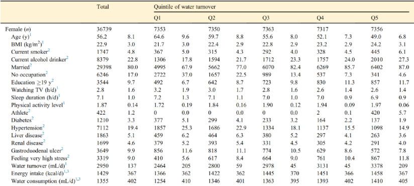 研究者从大型前瞻性的日本协作队列(JACC)中收集到63,488名参与者的数据,随访时间长达19.4年。基于上述计算公式得到每名参与者的水周转率,并根据该数值将人群分为性别特异性的五分位数。结果显示,女性的平均日水周转率为2950mL,男性为3466mL。基础信息显示,水周转率高的人往往更年轻,同时部分慢性病(如糖尿病和高血压)的发病率越低。具体来说,在女性参与者中,最高五分位的每日水周率转达到3378mL/天,比最低的2464mL/天高出了914mL;而相对来说,水周转率高的人每日饮水量也会更大,最高五分位的女性参与者平均每日饮水量达到1410mL,而最低的仅为1254mL。类似情况也出现在男性参与者中,最高五分位的每日水周转率达到3967mL/天,日均饮水量达到1457mL,但最低五分位的水周转率和饮水量分别为2946mL/天和1303mL/天。