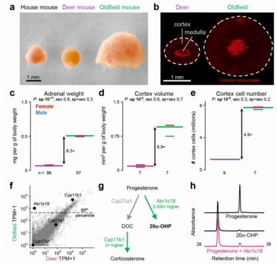 测量由差异表达基因编码的类固醇生成酶的底物和产物后,研究人员发现,20α-OHP在灰背鹿鼠每克肾上腺中的含量是滥交型小鼠的6.9倍,血浆中的20α-OHP水平也存在显著差异。
