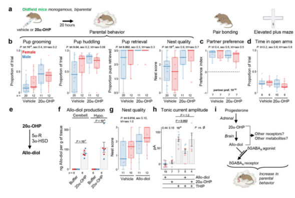 结果显示,20α-OHP可在体外被大脑组织代谢为allo-diol,且20α-OHP产生的allo-diol的绝对水平比孕酮高20倍以上。单次注射allo-diol可在一小时后增加性成熟滥交型小鼠的幼崽叼回行为,并诱导一夫一妻制小鼠父母的筑巢行为,提示高水平的循环20α-OHP可能通过转化为allo-diol来影响亲代行为。