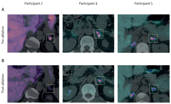 ▲从左至右分别为患者2、患者4和患者5在在微创消融前(图A)和微创消融后(图B)的PET-CT图像,方框所圈为分泌醛固酮腺瘤所在位置(图片来源:参考文献[1])
