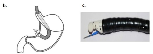 ▲左侧分泌醛固酮腺瘤消融示意图,消融针可穿过胃壁直达腺瘤(图B),以及带有超声探头和消融导管的内窥镜顶端实样(图C)(图片来源:参考文献[1])