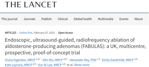 [1] Argentesi G, Wu X, Ney A, et al. Endoscopic, ultrasound-guided, radiofrequency ablation of aldosterone-producing adenomas (FABULAS): a UK, multicentre, prospective, proof-of-concept trial. Lancet. 2025 Feb 7:S0140-6736(24)02755-7. doi: 10.1016/S0140-6736(24)02755-7.