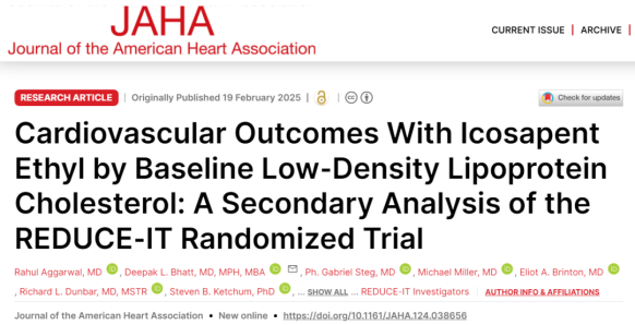 [1]Aggarwal R, Bhatt DL, Steg PG, et al. Cardiovascular Outcomes With Icosapent Ethyl by Baseline Low-Density Lipoprotein Cholesterol: A Secondary Analysis of the REDUCE-IT Randomized Trial. J Am Heart Assoc. 2025 Feb 19:e038656. doi: 10.1161/JAHA.124.038656.