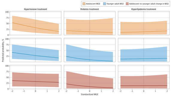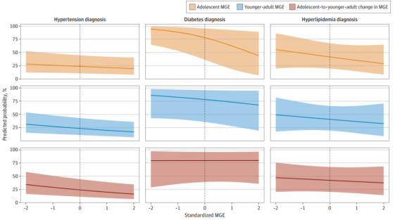 研究人员分析了参与者从青少年(12-18岁)到成年早期(24-32岁),再到中年(32-42岁)的数据。结果发现,每增加一个标准差的青少年MGE,成年后接受高血压治疗的概率降低11%,糖尿病确诊率降低15%。