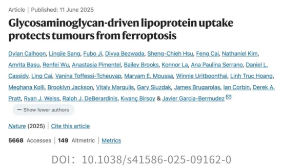 [1]Calhoon D, Sang L, Ji F, Bezwada D, Hsu SC, Cai F, Kim N, Basu A, Wu R, Pimentel A, Brooks B, La K, Paulina Serrano A, Cassidy DL, Cai L, Toffessi-Tcheuyap V, Moussa ME, Uritboonthai W, Hoang LT, Kolli M, Jackson B, Margulis V, Siuzdak G, Brugarolas J, Corbin I, Pratt DA, Weiss RJ, DeBerardinis RJ, Birsoy K, Garcia-Bermudez J. Glycosaminoglycan-driven lipoprotein uptake protects tumours from ferroptosis. Nature. 2025 Jun 11. doi: 10.1038/s41586-025-09162-0. Epub ahead of print. PMID: 40500442.