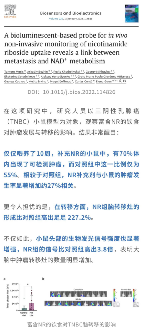 总的来看,这项研究发出了一个明确的信号:补充烟酰胺核苷(NR)不仅与肿瘤发生率的升高密切相关,更显著增加了癌细胞向大脑转移的风险。