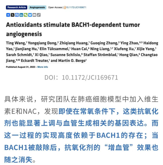 更令人意外的是,BACH1还得到了抗氧化剂的强力支持。维生素E和N-乙酰半胱氨酸(NAC)这类经典抗氧化剂,竟能通过稳定BACH1的方式,促进肿瘤新血管的形成,给肿瘤的“供氧通道”开了绿灯。