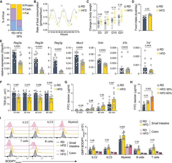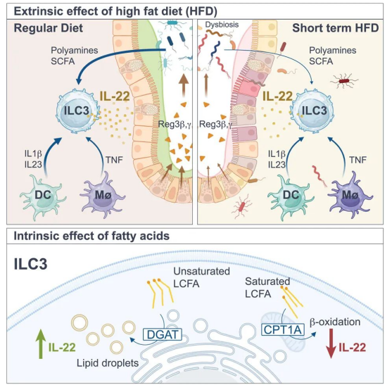 长期高脂饮食(HFD)作为肥胖和相关代谢疾病的主要影响因素,已被广泛研究(如系统性炎症、肠道菌群失调和代谢紊乱等),但短期高脂饮食是否能迅速扰乱肠道免疫稳态及屏障功能尚不明确。白介素22(IL-22)是维持肠道屏障完整性和免疫稳态的关键细胞因子,通过有益共生菌促进肠道定殖,预防肠炎。3型天然淋巴样细胞(ILC3)可以持续分泌IL-22,来维持屏障稳态,抵御病原体入侵。所以ILC3功能障碍与肠炎、代谢疾病等息息相关。因此,探究短期HFD对肠道ILC3s功能及其稳态的影响,对于理解饮食介导的慢性病的发生机制具有重要意义。