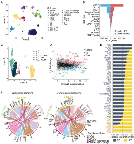 其次,研究员通过CITEseq分析发现,HFD显著影响肠道固有免疫细胞,仅两天就使得ILC3分泌IL-22的能力下降(7天后最高达到50%),细胞活性和增殖能力同步减弱,并且参与糖酵解的HK2表达减少,同时抑制IL-22的产生,促进IFN-γ的表达,改变了细胞间通信和信号传导。此外,HFD还减少巨噬细胞和树突状细胞分泌的IL-23和IL-1β,进一步削弱ILC3的炎症应答能力。但是通过恢复常规饮食,可以部分恢复ILC3的功能和肠道稳态。
