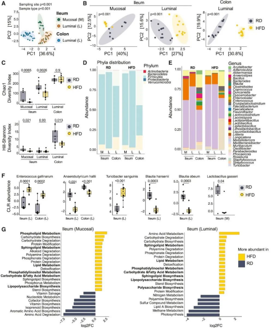 研究员发现,饲喂小鼠7天HFD后,肠道上皮屏障受损,抗菌肽(如Reg3家族)、黏蛋白(Muc2)、紧密连接蛋白(如Occludin)等表达下调,肠道通透性增加,屏障功能受损;并且改变了肠道脂质代谢和脂质组成,导致小肠中的饱和脂肪酸(如棕榈酸PA、硬脂酸SA)等大量沉积;此外,也导致了肠道菌群失调,有益菌(如Anaerobutyricumhallii)减少,有害菌(如Enterococcusgallinarum)增加,微生物代谢产物和代谢途径发生改变,进一步加剧屏障破坏。