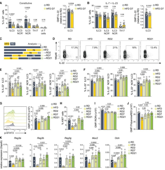 2.HFD诱导ILC3功能受损,损害肠炎后的稳态恢复,让ILC3的分泌能力大幅下降
