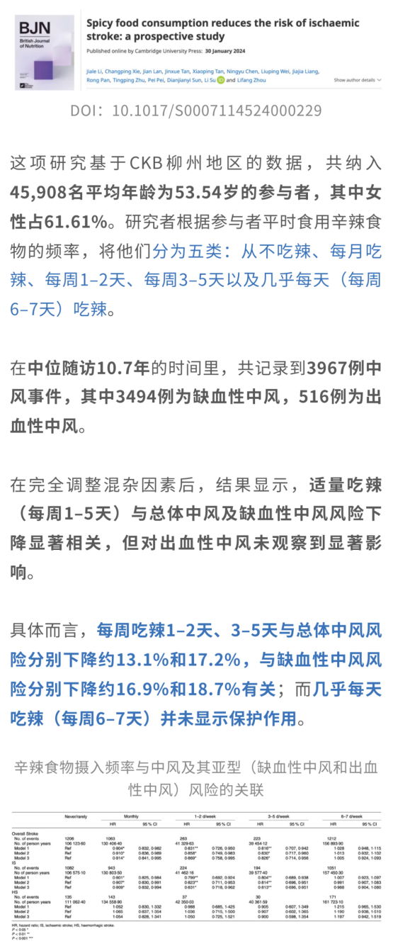 来自广西医科大学等团队的一项研究[3]在中国南方人群中进行了探索,该研究发表于British Journal of Nutrition。研究显示,辛辣食物摄入与缺血性中风风险呈负相关,并呈现U型剂量–反应关系——每周食用3–5天的人群中风风险最低。