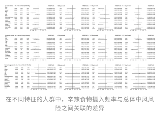 随后亚组分析揭示,适度吃辣的保护作用在不同人群中存在差异。男性在每周3–5天吃辣时获益最明显,而女性在每周1–2天效果更佳。且相较于体重正常/偏轻者,肥胖人群从每周3-5天吃辣中获益更显著。另外,生活方式也会调节效果:吸烟或饮酒者需每周吃辣3–5天才能获得保护,而不吸烟或不饮酒者每周吃辣1–2天即可显著受益。