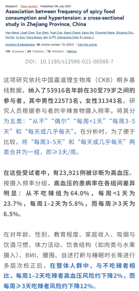 [2]Wang H, Chen L, Shen D, Cao Y, Zhang X, Xie K, Wang C, Zhu S, Pei P, Guo Y, Bragg F, Yu M, Chen Z, Li L. Association between frequency of spicy food consumption and hypertension: a cross-sectional study in Zhejiang Province, China. Nutr Metab (Lond). 2021 Jul 6;18(1):70. doi: 10.1186/s12986-021-00588-7. PMID: 34229688; PMCID: PMC8259443.