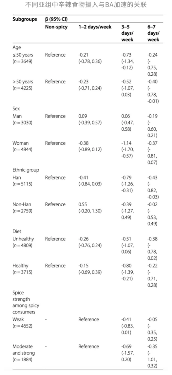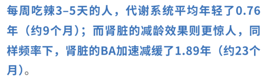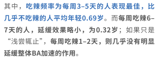 结果显示,相比几乎不吃辣的人,经常吃辣的人在随访时的整体BA加速更低,也就是说,他们的身体机能似乎比同龄人慢了一点“衰老的脚步”。