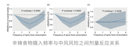 更精细的剂量–反应分析显示,吃辣频率与中风风险呈U型曲线:既不是多多益善,也不是浅尝辄止就足够,中等频率(每周3–5天)最为理想。