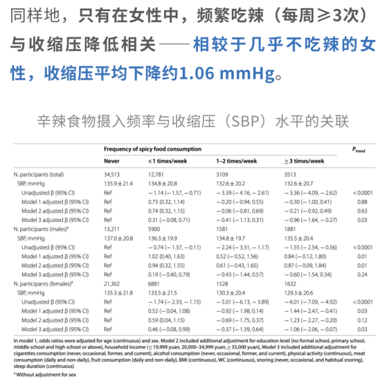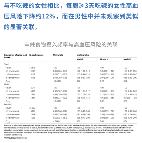 总的来说,这项基于大样本的观察性研究在充分校正已知混杂因素后,提示适当摄入辛辣食物(每周≥3天)与女性高血压风险及收缩压的轻度下降显著相关,但在男性中未见类似保护性关联。