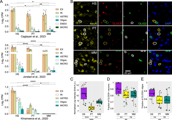 作为核心昼夜节律基因,CLOCK在人类新皮层中却呈现三大“反常” 特征:高表达且无节律性,调控大量非节律基因,且这种表达模式仅在人类中存在。论文共同通讯作者Genevieve Konopka 指出:“人类与非人灵长类的基因组对比反复显示,CLOCK在人类新皮层中特异性上调,这暗示它可能是人类高级认知进化的关键推手。”