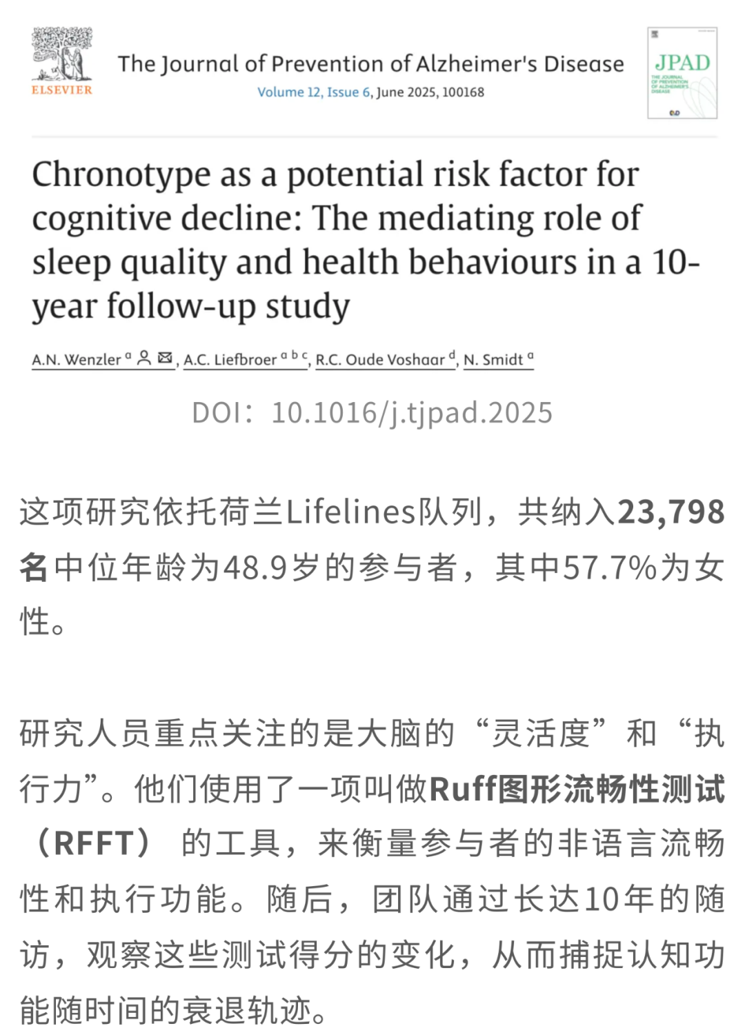 如果熬夜只是困点、累点,或许还能安慰自己“年轻嘛,顶得住”。但问题来了——一项发表在The Journal of Prevention of Alzheimer’s Disease的研究[1]却提醒我们:要是“夜猫子”身份再叠个buff,比如高学历,那熬夜可能就不只是黑眼圈和上班迟到的问题了。该研究表明,时型——也就是我们常说的“早起鸟”还是“夜猫子”——与中老年人群的认知功能衰退有关,但这种关联仅在高学历群体中显著。