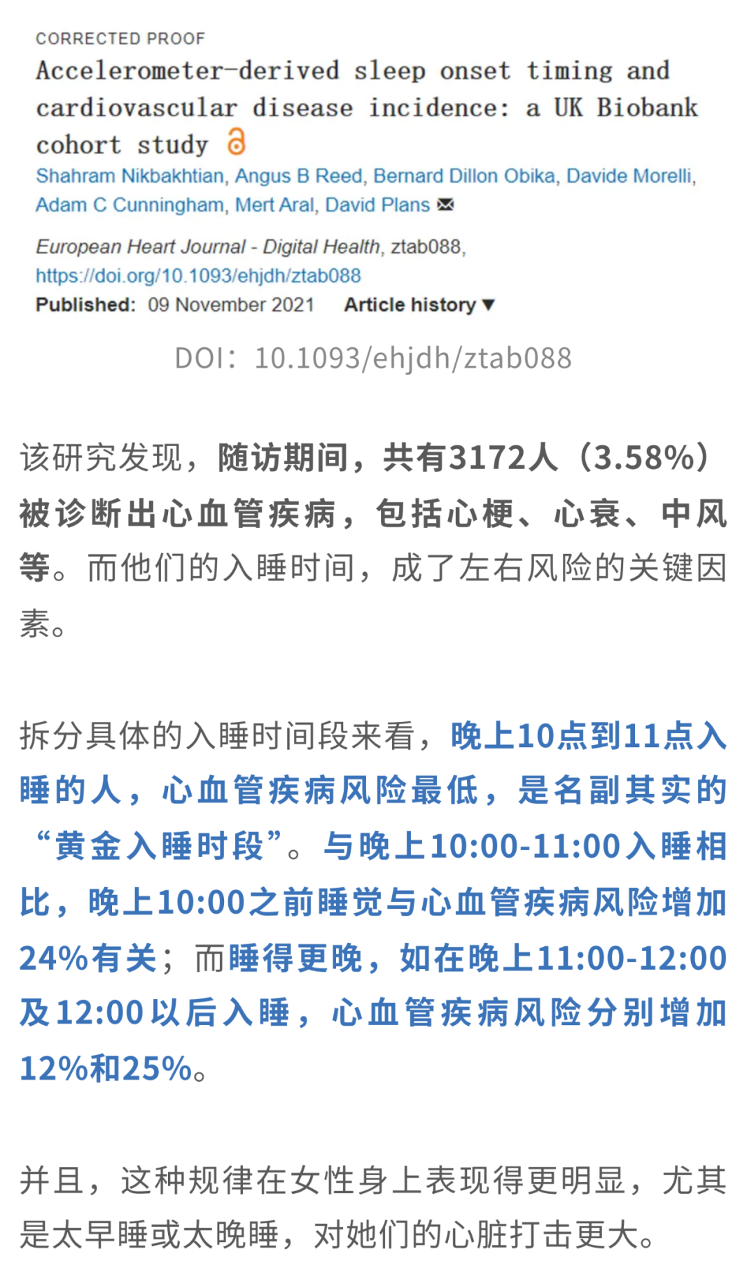 [5]Nikbakhtian S, Reed AB, Obika BD, Morelli D, Cunningham AC, Aral M, Plans D. Accelerometer-derived sleep onset timing and cardiovascular disease incidence: a UK Biobank cohort study. Eur Heart J Digit Health. 2021 Nov 9;2(4):658-666. doi: 10.1093/ehjdh/ztab088. PMID: 36713092; PMCID: PMC9708010.