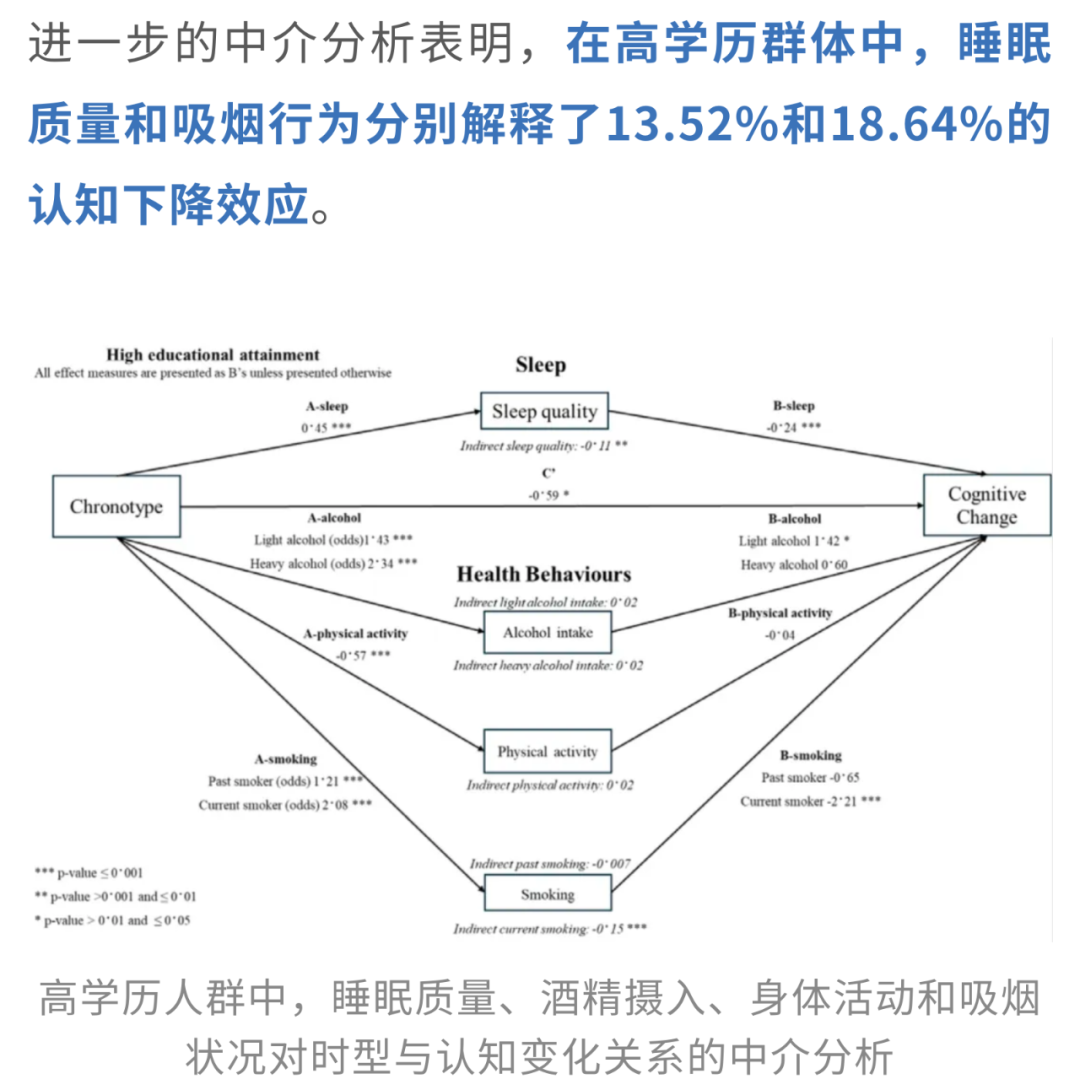 总的来说,这项研究提示,对于高学历的中老年群体,“夜猫子”时型与认知衰退显著相关。这种关联部分通过睡眠质量和吸烟行为来实现。