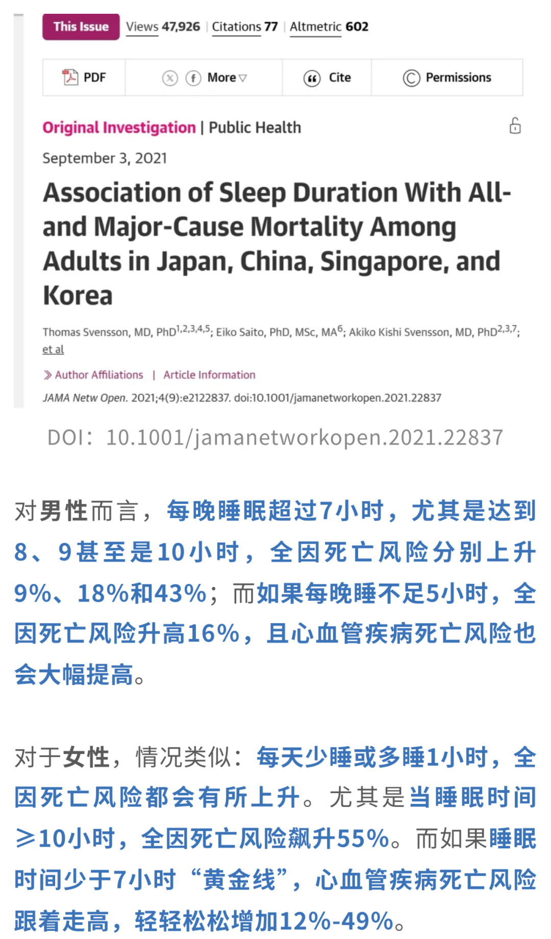 [4]Svensson T, Saito E, Svensson AK, Melander O, Orho-Melander M, Mimura M, Rahman S, Sawada N, Koh WP, Shu XO, Tsuji I, Kanemura S, Park SK, Nagata C, Tsugane S, Cai H, Yuan JM, Matsuyama S, Sugawara Y, Wada K, Yoo KY, Chia KS, Boffetta P, Ahsan H, Zheng W, Kang D, Potter JD, Inoue M. Association of Sleep Duration With All- and Major-Cause Mortality Among Adults in Japan, China, Singapore, and Korea. JAMA Netw Open. 2021 Sep 1;4(9):e2122837. doi: 10.1001/jamanetworkopen.2021.22837. PMID: 34477853; PMCID: PMC8417759.