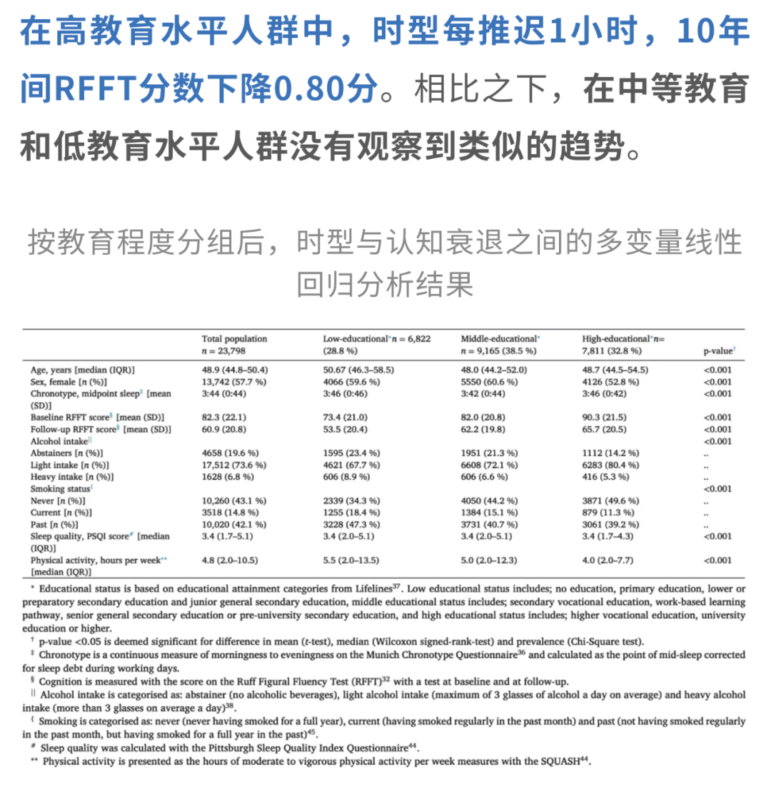 那么,到底哪些人更容易受到“晚睡”的伤害呢?进一步的调节效应分析显示,年龄和性别并不会改变作息类型和认知下降的关系,但教育水平却起到了关键影响。