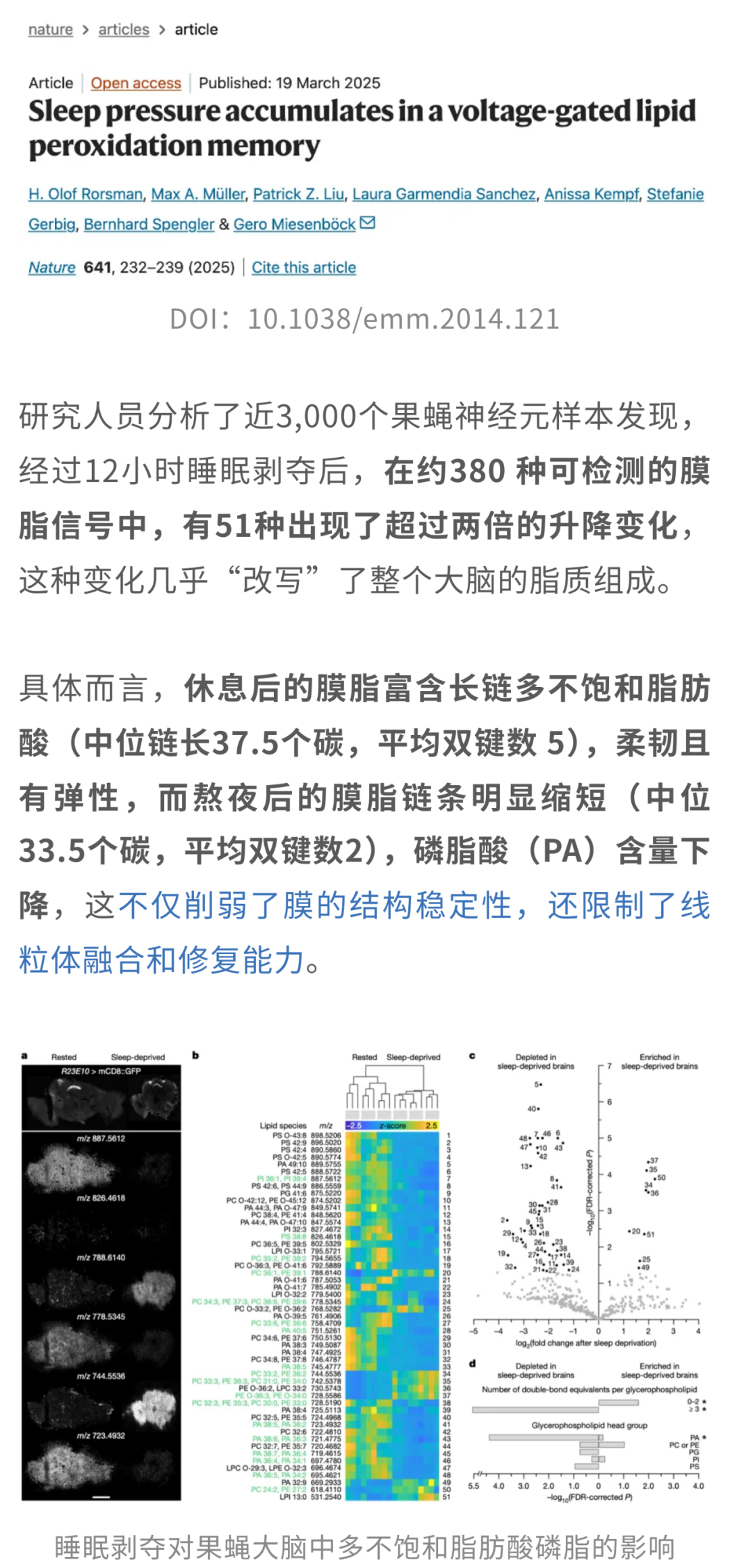 发表于Nature的一项研究[3]发现,当果蝇被迫熬夜时,它们大脑里的甘油磷脂种类变得单一,原本修长的脂肪链也被削短了。这样的变化让细胞膜失去了应有的韧性,变得僵硬脆弱,抵抗氧化损伤的能力也明显下降,最终让整个大脑陷入一种普遍的氧化压力状态。