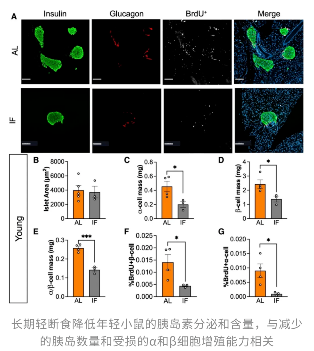 研究进行了10周的饮食干预后,轻断食在不同年龄小鼠身上的效果就出现差异了。中年和老年小鼠代谢出现了一定的改善;但年轻小鼠不仅代谢没有改善,β细胞功能反而出现了受损,胰岛素分泌水平也下降了。