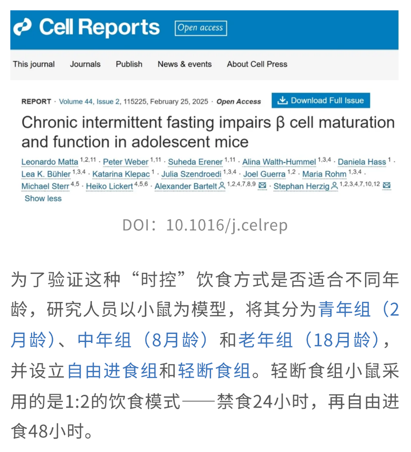 并不是这样!一项发表于Cell Reports的研究[2]给出的答案就让很多年轻群体一“断”一个不吱声。这项研究发现,长期轻断食可能让年轻群体β细胞功能受损,从而增加未来代谢疾病的风险。