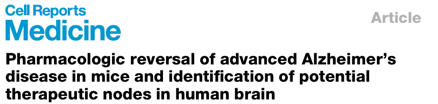 Chaubey K, Vázquez-Rosa E, Tripathi SJ et al. Pharmacologic reversal of advanced Alzheimer's disease in mice and identification of potential therapeutic nodes in human brain. Cell Rep Med. 2025 Dec 22:102535. doi: 10.1016/j.xcrm.2025.102535. Epub ahead of print. PMID: 41435831.