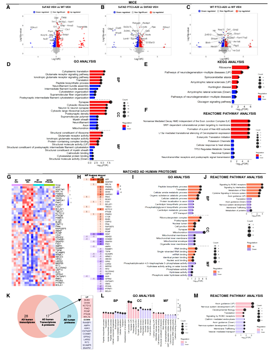 通过对治疗后的5xFAD小鼠海马组织进行蛋白质组学分析,并将其与整合了38项独立研究的人类AD大脑蛋白质组数据库进行跨物种比对,研究团队成功绘制出一个关键的“逆转相关蛋白网络”!他们锁定了46个蛋白质,它们在人类和鼠类AD大脑中呈现同方向异常,并在P7C3-A20治疗后同步恢复正常。