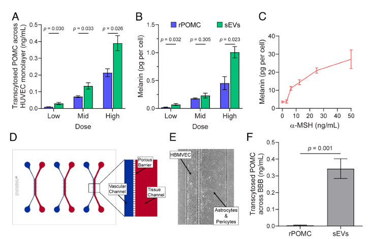 功能验证实验中,研究团队通过Transwell模型和类血脑屏障微流控芯片(SynBBB™ 3-PLEX)证实,与sEVs结合的POMC穿过内皮细胞单层的效率是游离POMC的两倍,且能成功跨越结构更复杂的血脑屏障,而游离POMC则无法实现这一转运。此外,sEVs结合型POMC还能有效诱导B16-F10黑色素瘤细胞产生黑色素,与POMC衍生促黑素的生理功能一致,表明其生物活性得以完整保留。