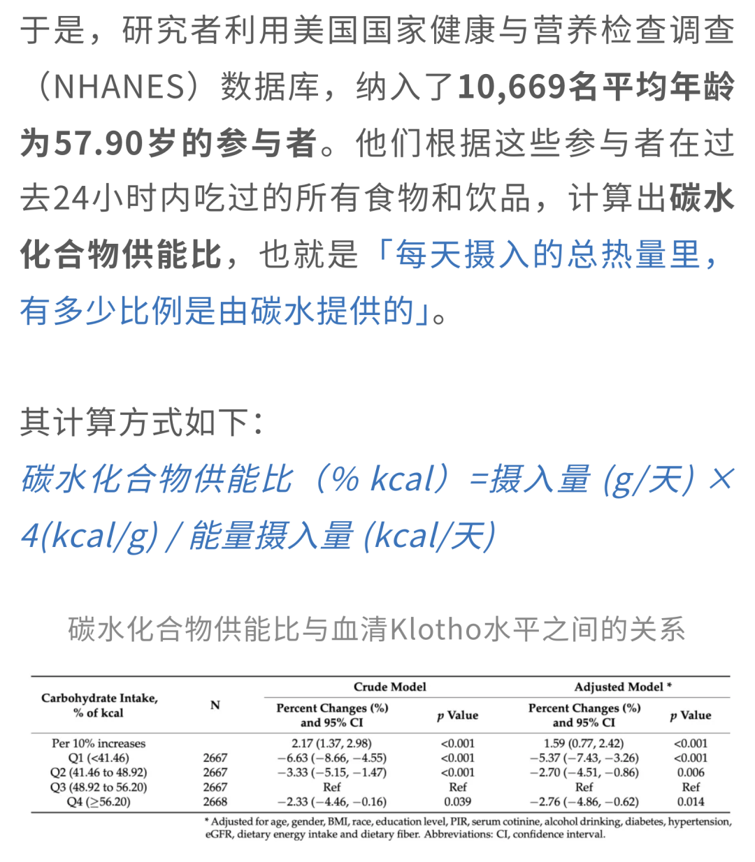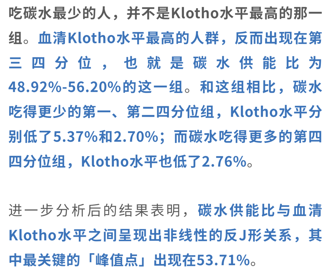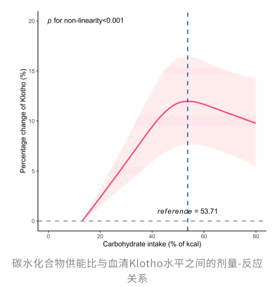 也就是说,碳水吃少了吃多了都不是明智之举。当一个人每天摄入的总能量中,大约有53.71%来自碳水化合物时,血清Klotho水平最理想。