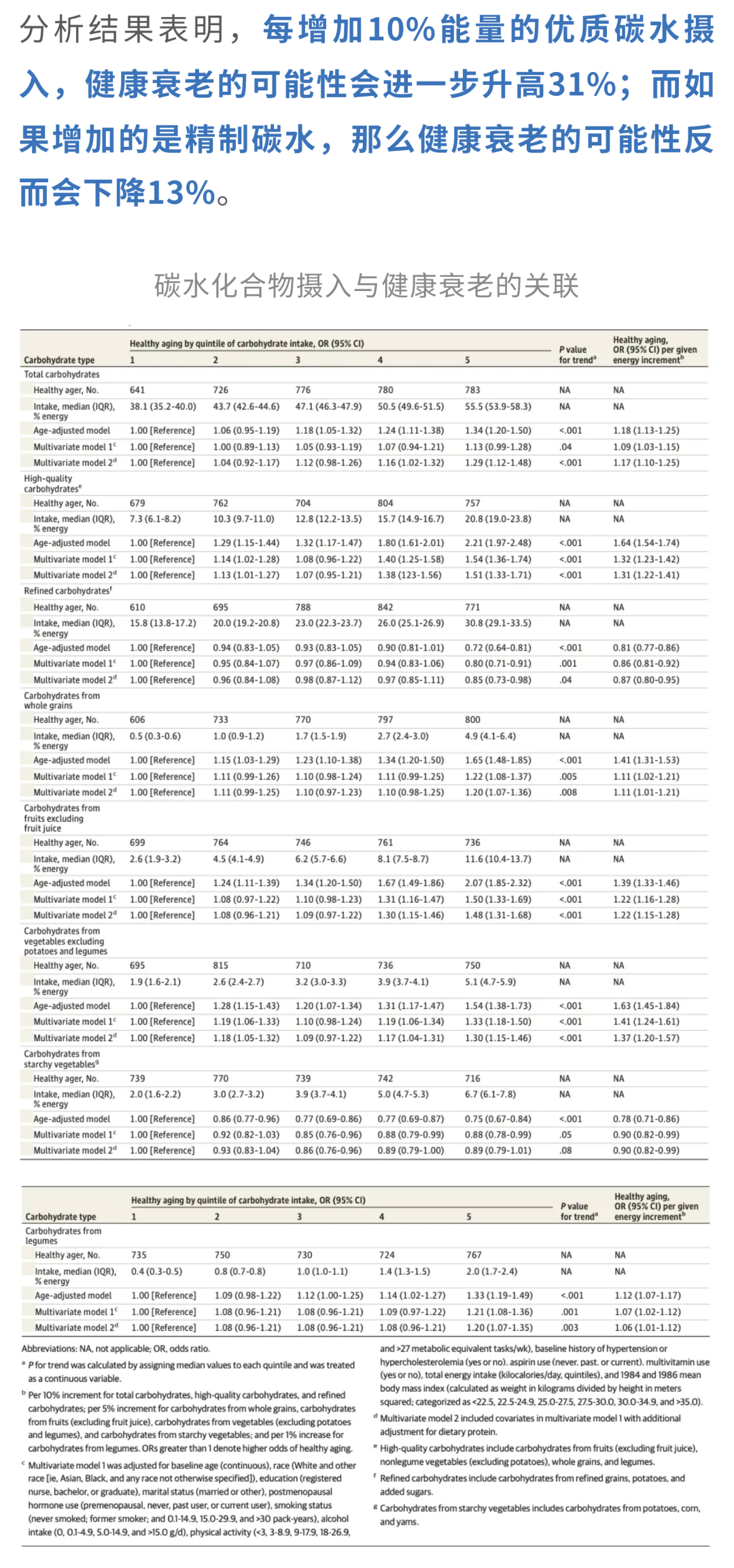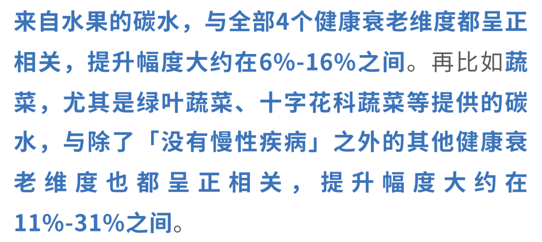 研究发现,当总碳水化合物摄入量占总能量的50%-55%时,人群健康衰老的可能性最高。真正决定差距的,不只是「吃了多少」,更是「吃了什么」。每增加10%能量的高质量碳水化合物(比如全谷物、水果、蔬菜和豆类),健康衰老的可能性就会上升31%;相反,如果增加的是精制碳水化合物,那么健康衰老的可能性反而会下降13%。